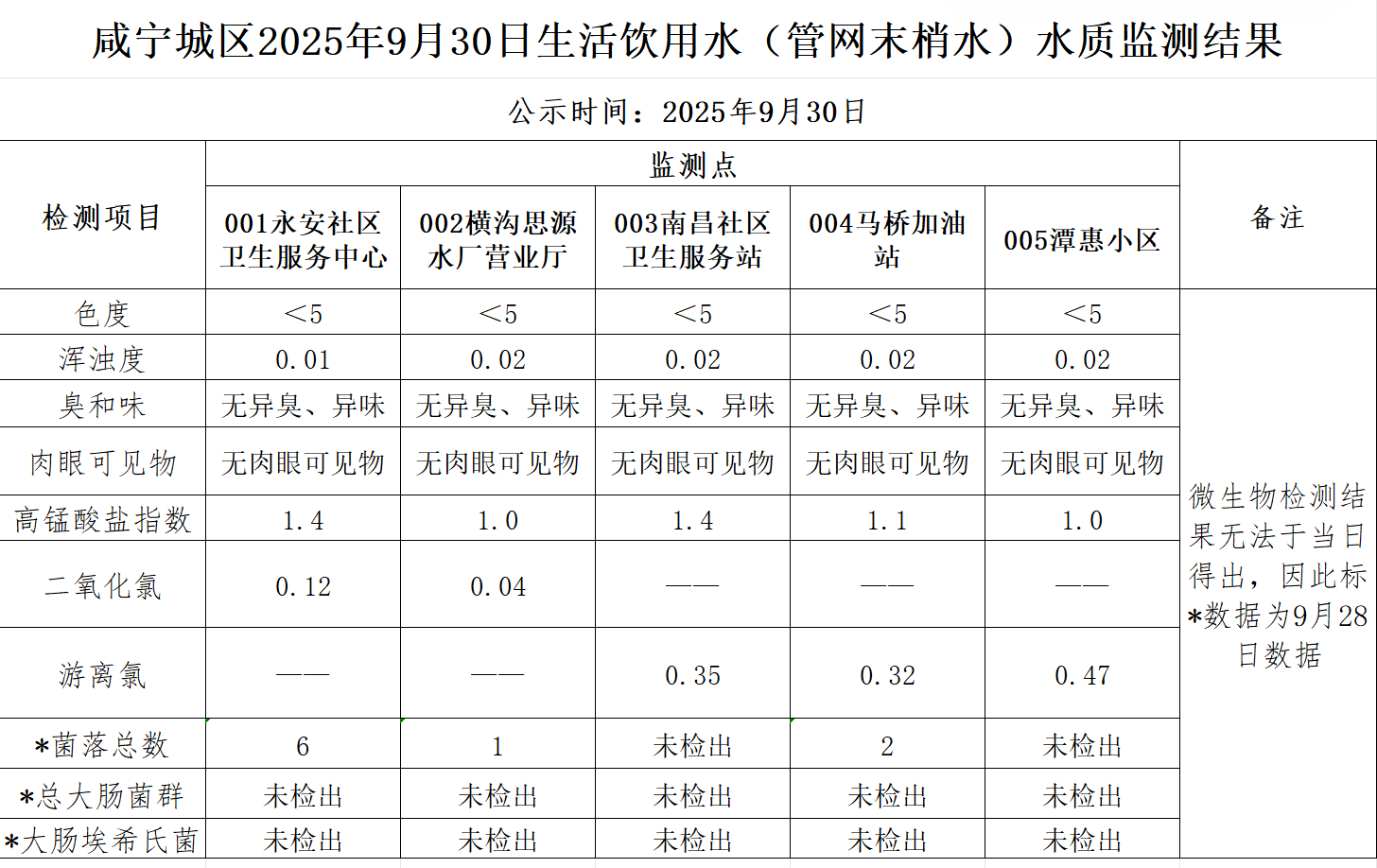 2025年9月30日咸宁城区生活饮用水监测结果公示