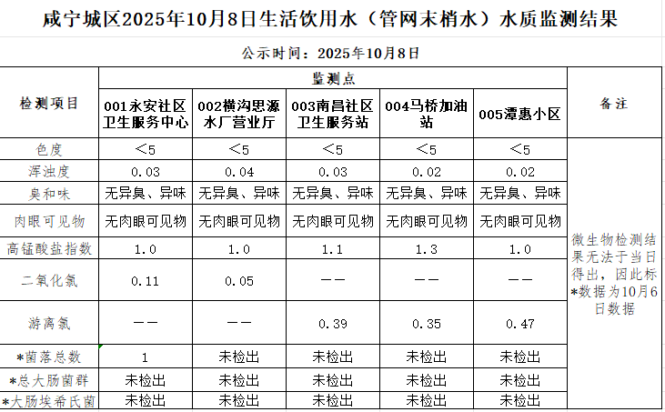 2025年10月8日咸宁城区生活饮用水监测结果公示