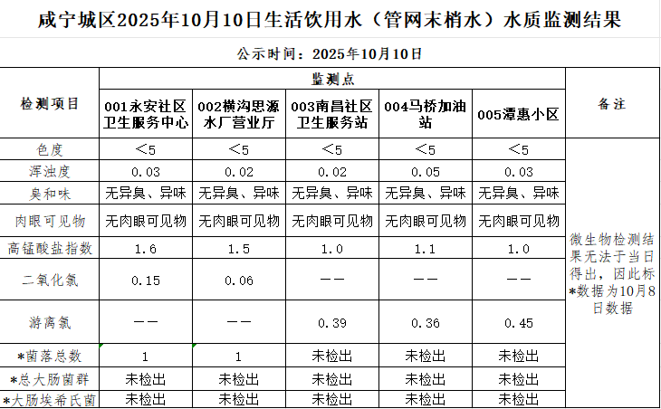 2025年10月10日咸宁城区生活饮用水监测结果公示