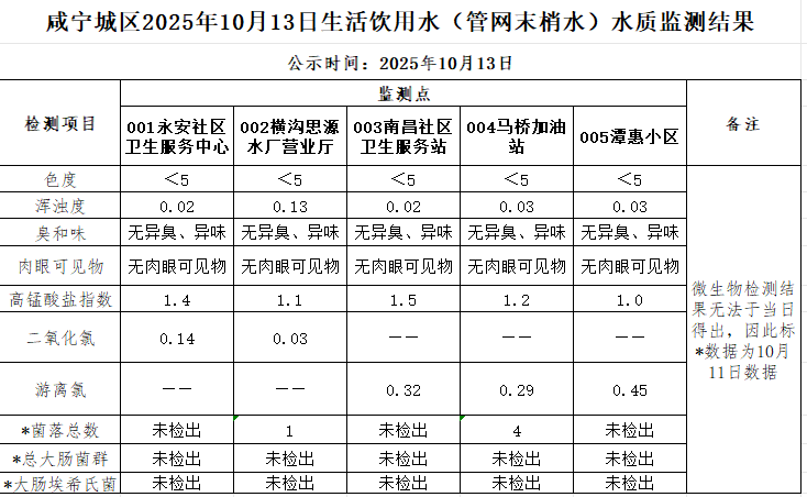 2025年10月13日咸宁城区生活饮用水监测结果公示